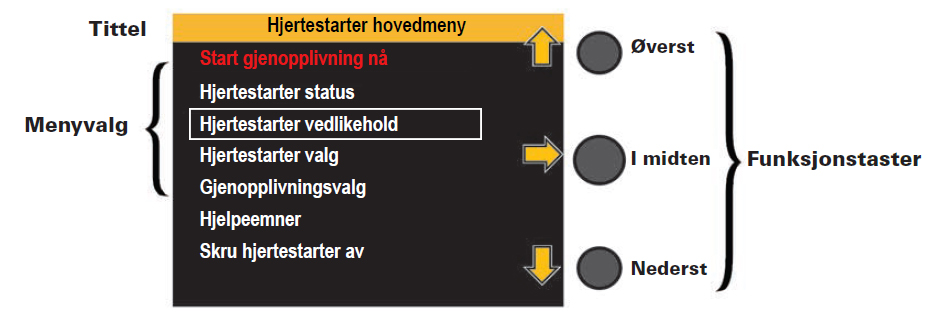 Hva dette gjør: Når brukeren velger “Utfør test av hjertestarter” og trykker på den MIDTERSTE funksjonstasten, vil enheten begynne å utføre selvtesten:
