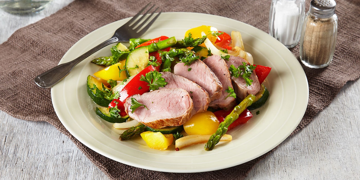 - Ta kjøttet ut, og la det hvile i 5 minutter mens grønnsakene fremdeles står i ovnen. Kutt opp kjøttet, og legg oppå grønnsakene før servering.